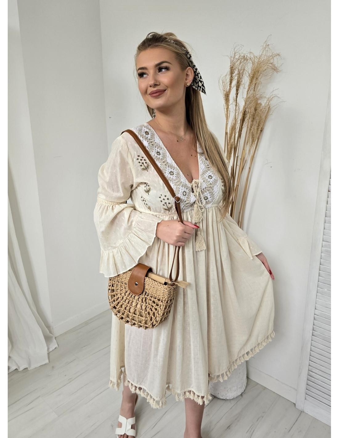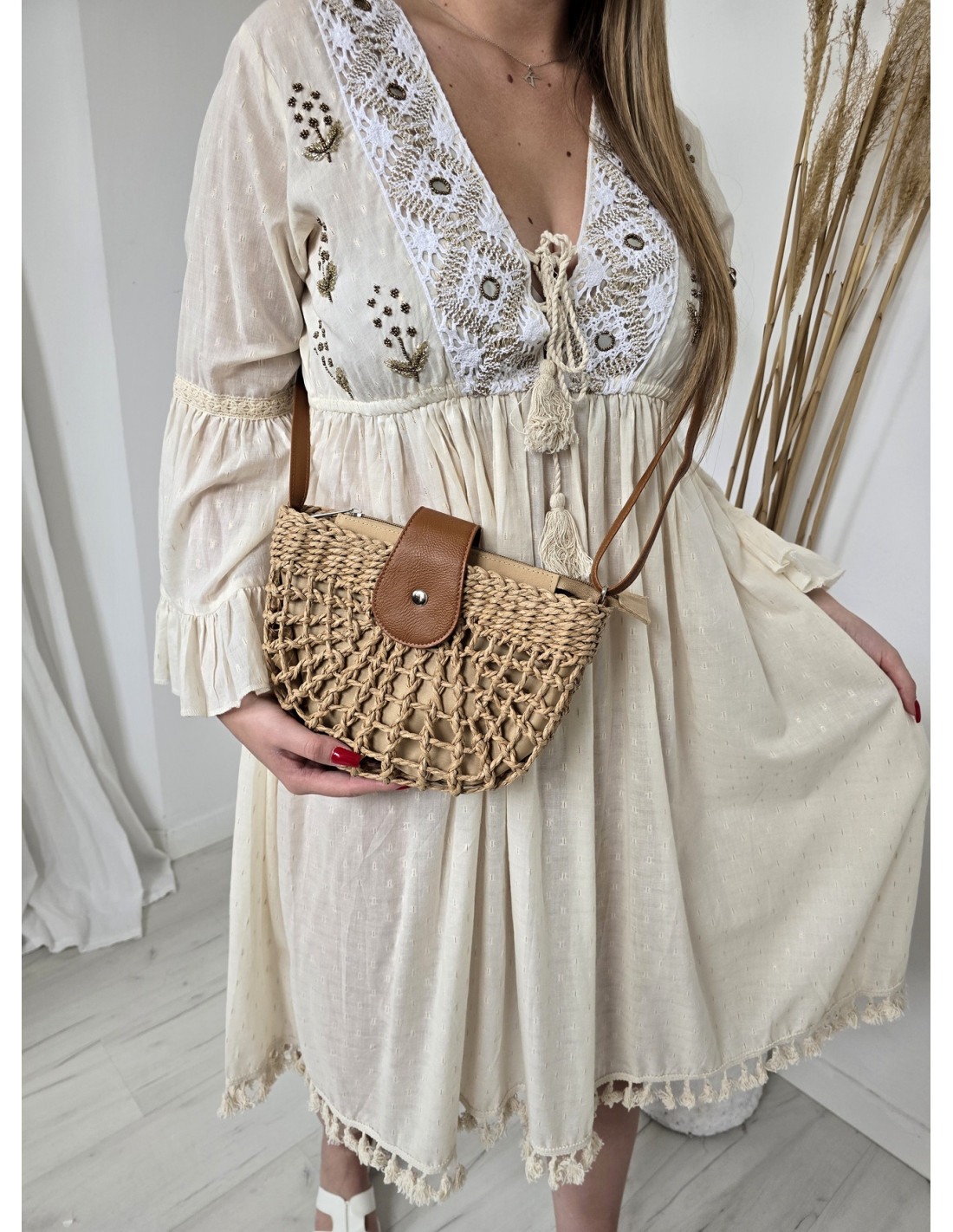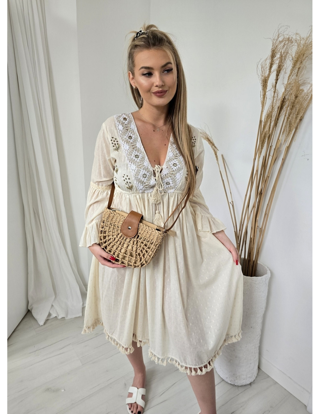 Nowość Kategorie Wiskozowa sukienka maxi 269 269 Materiał stanowi: 65% wiskoza, 35% poliester Rozmiar: Uni Model posiada regulowane ramiączka oraz gumkowanie w talii. Model wysadzany delikatnymi cyrkoniami. Zobacz
